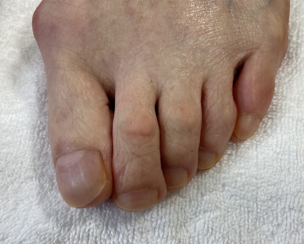 外反母趾になると、親指が人差し指側へ傾きます。
