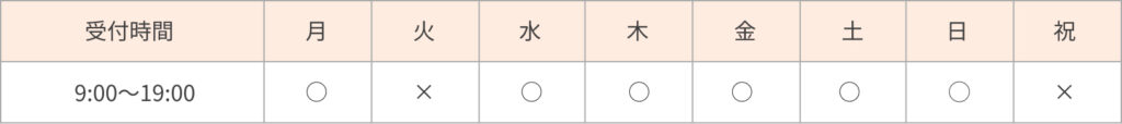 ◼︎受付時間 9:00~19:00(最終受付:17:00)